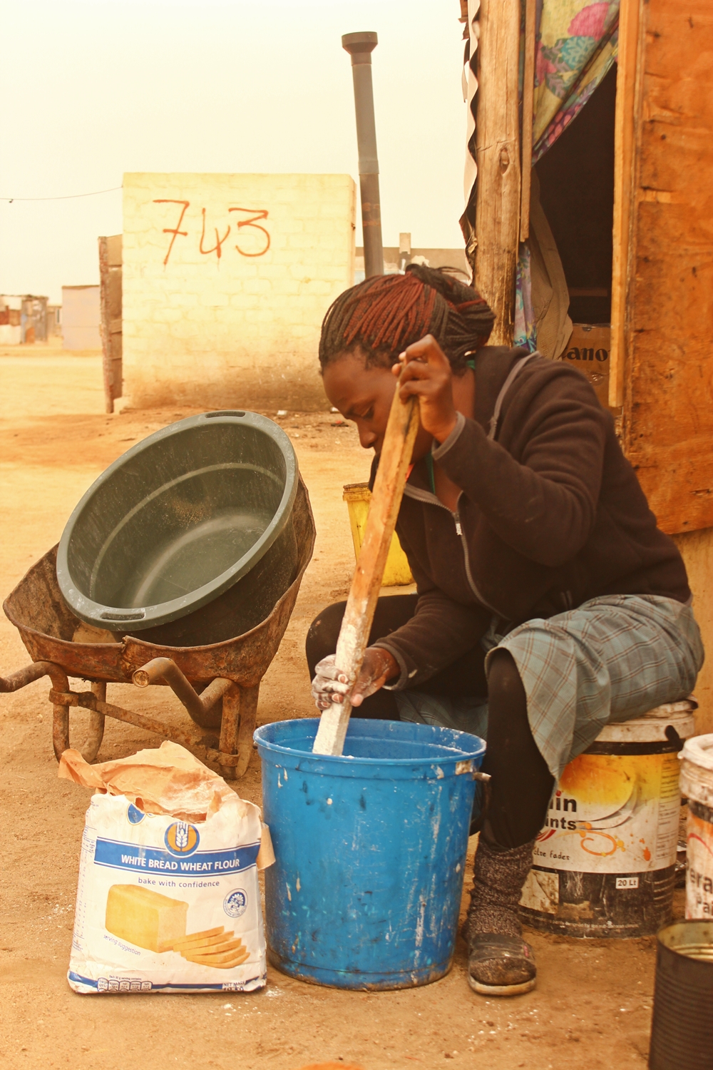 Während meines Tiefs vor drei Monaten, als es mir schlecht ging, habe ich sie kennengelernt. Sie kam zu mir ins Office und fragte mich, ob ich ihr einige Kopien von ihren Dokumenten machen könne, wobei ich mich vielmehr auf ihr dickes Bäuchlein konzentriert habe als auf ihre Bitte nach Kopien und so kamen wir ins Gespräch. Ich wusste schon immer, dass sie auf der anderen Straßenseite lebt und arbeitet. Sie besitzt einen Tuck-Shop, eine Art Kiosk, und verkauft dort Fatcakes, Fisch, Fleisch, Zucker und alles, was Bewohner des „Townships“ gebrauchen und direkt verspeisen können. Der nächste Supermarkt ist viel zu weit entfernt, sodass der Gang zu einem Tuck-Shop vorteilhafter ist. Sie backt und kocht morgens, um nachmittags ihren Shop eröffnen und Geld verdienen zu können, um sich und ihr Kind über die Runden zu bringen.