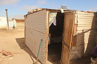 Auf diesem Bild stehen wir vor ihrem Tuck-Shop, hinter der ihr ebenso ein Wohnraum zur Verfügung steht. Wenn man genauer hinschaut, sieht man das Leuchten einer Lampe in ihrem Shop. Wie ist es möglich, dass sie Strom hat? Ich erwähnte bereits, dass die Hütten selbst keinen Wasser- oder Stromanschluss und keine Kanalisation haben. Alle 300 Meter gibt es eine Wasserstelle, an der gegen Bezahlung mittels einer Karte, die man immer wieder aufladen kann, Wasser geholt werden kann. Straßenlaternen und einen Flutlichtmast in der Mitte des „Townships“ soll vor allem zur Vorbeugung von Kriminalität dienen. Die Stadtbehörde hat bereits über 300 Trockentoiletten kostenlos installiert. Wie ist es also möglich, dass in Beathas Shop eine Glühlampe leuchtet? Ganz einfach – es handelt sich um eine solarbetriebene Lampe. Immer, wenn ich zu Gast bei ihr war, sah ich eine Kerze auf ihrem Tisch stehen, die sie abends nutzt, um ihr Baby zu stillen, sonst hat sie keine Chance irgendetwas sehen zu können. Da es hier sehr oft der Fall ist, dass Hütten anbrennen, fühlte ich mich verantwortlich die Kerze wegzuschaffen, besonders zum Schutz für Tangeni. Ihr eine Taschenlampe zu schenken, wäre auf Dauer durch das Kaufen von Batterien sehr teuer, so entschied ich mich für eine Solarenergieausstattung, die sie tagsüber durch Sonnenlicht aufladen muss und abends nutzen kann. Eine teure, aber nachhaltige Investition, die sich in meinen Augen gelohnt hat.