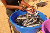 Auf diesem Foto schneidet Beatha Fische durch die Mitte, holt Organe raus und brät diese an. Der Fisch schmeckt sehr lecker und ich kenne das Gericht aus der türkischen Küche. Meine Mutter hat diese Köstlichkeit selten zubereitet, dafür habe ich mich umso mehr gefreut, als es hieß: „Heute gibt es Hamsi“ –gebratene Sardellen. Beatha weiß wie sie Kunden anlocken kann, denn nicht jeder Tuck-Shop bietet diese Spezialität an, sodass sie sich immer wieder überlegt, etwas Spezielles anzubieten, damit ihr die Kunden nicht ausbleiben und sie der Konkurrenz standhalten kann.