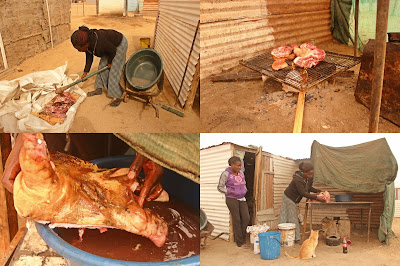Auf diesem Bild schlägt sie den Kopf eines Schweines klein, legt ihn anschließend aufs Feuer, um ihn anzubraten, und macht diesen sauber. Anschließend wird dieser weitergebraten bis das Fleisch durch ist und in kleine Fleischstückchen geschnitten. Eine traditionelle Köstlichkeit, die die Bewohner des „Townships“ mit Genuss verzehren.