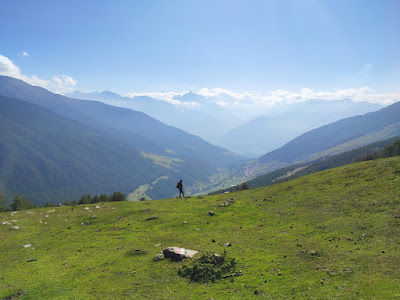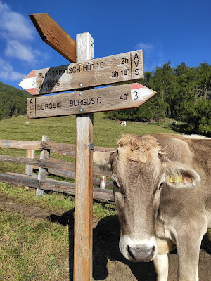 Die einzige Frage, die sich morgens nach dem Aufstehen stellt, ist: Wie warm muss ich mich anziehen? Ansonsten ist ein Wanderurlaub völlig sorgenfrei. Um die Route hat man sich vorher Gedanken gemacht, um den Weg dorthin auch, am besten kann man ohne große Anreise direkt losgehen, die Schuhfrage ist ebenso geklärt wie die nach der Tasche (Wanderstiefel und Rucksack), es ist egal, ob man die Haare gewaschen hat oder nicht und wie sehr das Shirt vom Vortag schon müffelt. Riegel, Nüsse, Karte, Wasser, Handschuhe und ein Fleece, mehr braucht es nicht, um sich gut gelaunt für die Herausforderungen des Tages gerüstet zu sehen. Man wird den ganzen Tag draußen herumlaufen, mal mehr, mal weniger reden, meistens weniger, einen Fuß vor den anderen setzen, mit etwas Glück zwischendurch eine schöne Einkehr haben, abends fällt man wohlig erschöpft ins Bett und schläft wie ein Murmeltier. Von denen man tagsüber viele am Hang hat pfeifen hören und manche auch auf ihren Aussichtsplätzen hat sitzen sehen. Wenn man sich weiterbilden möchte, versucht man sich neue Vogelarten oder Pilzsorten zu merken, nachdem man sie mühevoll versucht hat zu bestimmen. Auch die kulinarischen Kenntnisse lassen sich durch Rauf- und Runterprobieren der ausladenden Digestif-Angebote von A wie Apfel über E wie Enzian und M wie Marille bis Z wie Zwetschge verfeinern. Die Tage sind randvoll, angefüllt mit Eindrücken, An- und Aussichten und Begegnungen, weit überwiegend mit unterschiedlich gezottelten Vierbeinern statt mit funktionsbekleideten Zweibeinern, und auch diese Zufallsbegegnungen sind stets reizvoll – schließlich hat man ein alle verbindendes, alles bestimmendes Gesprächsthema: das gemeinsame Hobby, den Berg. Die schönsten Wanderungen haben der Mann und ich dieses Jahr spontanen Abweichungen von der Route durch Tipps anderer Wandernder zu verdanken: Geht nicht hier herunter ins Tal, nehmt den Weg 15 auf der anderen Seite des Hanges, der euch über schöne Aussichten und Almwege ins Dorf bringt. Steigt nicht vom Nachbarort über die Route, die in allen Wanderführern steht, auf die Spitzige Lun, lasst euch ins stille Planail bringen und geht von dort einsam stundenlang steil auf schönsten Pfaden durch den Lärchenwald.