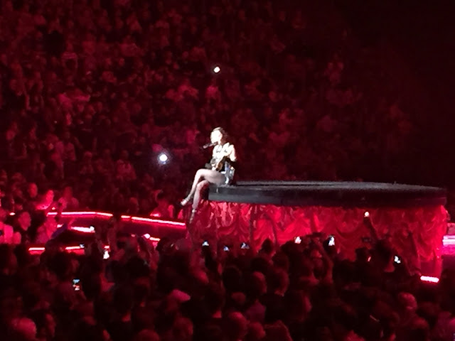 Damit hat sich die Queen of Pop gestern Abend von ihrem Publikum in Köln verabschiedet. Madonna darf das. Mehr als zwei Stunden geballte Madonna-Power auf der Bühne, ein irre aufwendiges Setting, Wahnsinns-Sound, Top-Tänzer, fantasievolle Kostüme und eine sehr entspannte, lockere Protagonistin machten diesen Abend zu einem der magischsten meines Lebens. Lange, lange ließ das Idol, das mich durch die Jahrzehnte begleitet, ihre Fans warten. Mehr als zwei Stunden. Zum Glück kam der mit Sekt-Ausschank-Bauchladen bewappnete Zeitgenosse öfter des Weges. Zwei Stunden Zeit, Mitmenschen, Umsitzende, Arenapublikum zu betrachten. Viele homosexuelle Männer im Publikum, und viele Frauen in meinem Alter. Heterosexuelle Männer sind nicht so die Zielgruppe. Der ältere Mann drei Sitze weiter hat ein Opernglas dabei. Vermutlich, um an der partiell leicht bekleideten Madonna ein paar mehr Details in Augenschein nehmen zu können. Oder um sich damit zu beruhigen, dass sie von Nahem vielleicht doch nicht mehr so jung ausschaut wie auf Distanz. Die homosexuellen Männer tragen großflächig die für 40 Euro angebotenen Tour-Shirts. Ich bin zu knickerig. Auch 15 Euro für eine Rebel-Heart-Tasse mag ich nicht zahlen. Und eine Tasse passt irgendwie nicht zu Madonna, dieser konstant gegen Moralvorstellungen und sexuelle Restriktionen ansingenden Popsirene. „Schatz, Käffchen ausm Bitch-Becher?“ – „Njoh.“ Geht nicht. Also keine Konzert-Souvenirs außer denen im Kopf. Als Madonna zum ersten Track auf die Bühne kommt, vielmehr: einschwebt, in einem Käfig von oben einschwebt, muss ich fast weinen. Die Frau, deren Lieder ich schon als Kind im Adria-Urlaub nachhopste und -trällerte, ist plötzlich zum Greifen nah (es hat sich gelohnt, sehr viel Geld für nah an der Bühne gelegene Tickets auszugeben.) Der Ehemann sitzt neben mir und muss nicht fast weinen. Ganz und gar nicht. Überhaupt ist er emotional sehr viel weiter weg von der ganzen Geschichte, die sich uns darbietet, und während bei mir die Person, die Musik und die Gefühle Wellen der Begeisterung und des Glücks auslösen, die mich noch durch den nächsten Tag tragen (meine Kollegen erkennen mich nicht wieder), sagt der Mann nach dem Konzert, beim halbstündigen Im-Auto-Rumwarten im Parkhaus: „Aber die Show war schon ganz cool.“ Ich bin begeistert von dieser Frau, die es schon innerhalb von zwei Stunden schafft, in so viele verschiedene Rollen zu schlüpfen, und alle kauft man ihr ab, von Bitch bis Biedermeier. Dabei bleibt sie vollprofimäßig locker, schäkert mit dem Publikum, bietet mit 360-Grad-Perfektion ihre Choreographie, Show und ihren Gesang dar. Madonna kann mit baumelnden Beinen am Bühnenrand sitzen und mit ihrem Gitarren-Geträller an Nicole mit „Ein bisschen Frieden“ erinnern und zehn Minuten später im knappen Glitzerdress Pornoposen inszenieren. Und es funktioniert. In diesen zwei Stunden ebenso wie auf die Jahrzehnte übertragen, in denen sie ihr Aussehen, ihren Stil, ihre Musik immer wieder neu erfunden und Trends gesetzt hat. Diese Frau darf niemals aufhören, ihre Musik und ihre Show zu machen. Auch wenn es niederträchtige Frauenhasser gibt, beispielsweise bei der Süddeutschen, die megafiese Artikel über diese Ausnahmekünstlerin schreiben.