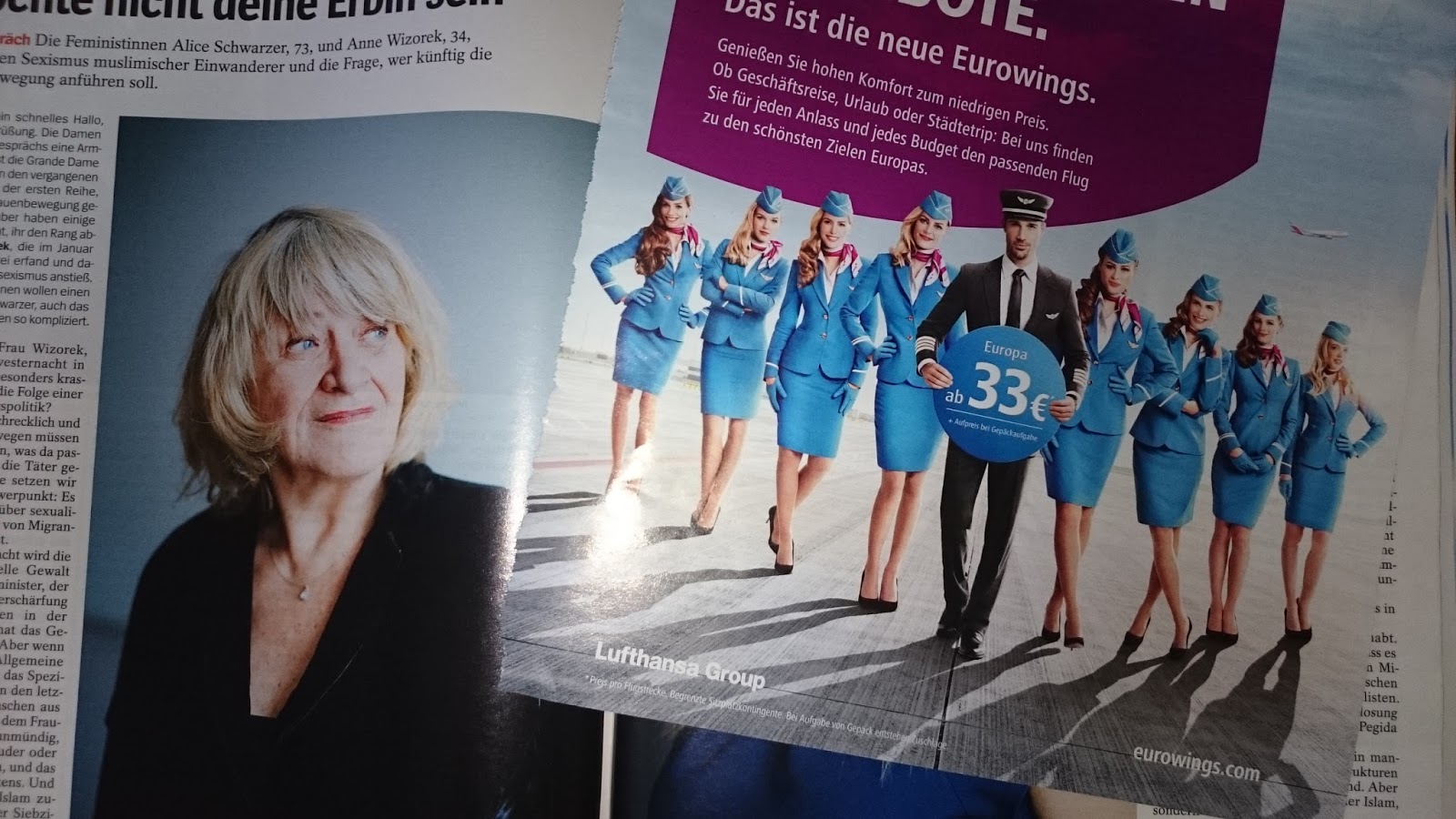 Ja, da guckt die Alice Schwarzer fragend. Auf die Anzeige der neuen Lufthansa-Tochter „Eurowings“ im aktuellen Spiegel. Passenderweise finden sich sowohl diese unmögliche Anzeige als auch ein Interview mit der Ober-Leit-Feministin schlechthin in der Print-Ausgabe des Nachrichtenmagazins, so dass ich mich zu diesem Foto genötigt sah. Bei der Eurowings und damit Lufthansa ist es also immernoch so wie im Film „Catch me if you can“ mit Leonardo di Caprio, der in den 1960ern (!) spielt. Cooler, smarter Typ in dunkler Pilotenuniform ist umringt von einem Rudel gutaussehender, langbeiniger und -haariger Stewardessen – sogar die Farbe der Uniformen ist identisch: