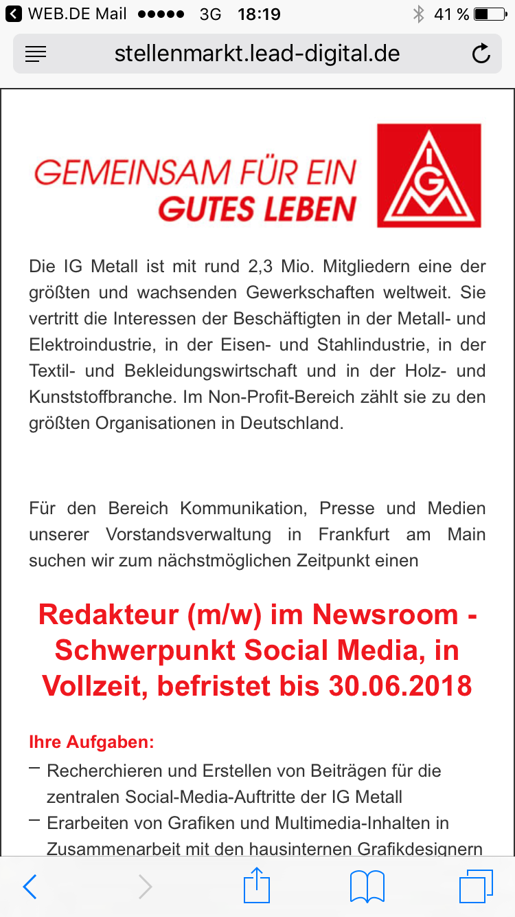schleimt die Stellenanzeige der IG Metall.
