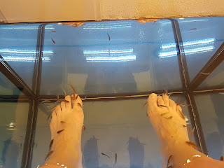 „Ein Fish Spa!“ Begeistert schleppe ich den Männe zum Schaufenster in der Nähe des Kölner Hohenstaufenrings. „Neueröffnung!“, verkündet ein Aufkleber auf der Scheibe. Nach regem Fischzuspruch an den Füßen im Bali-Urlaub 2015 bin ich großer Fan der knabbernden Minifische. (Für alle, die es genau nehmen: Nein, sie knabbern nicht, sie saugen, die Fische. Haben ja keine Zähne.) Freiwillig und mit Hingabe widmen sie sich im Schwarm der Pediküre. Die Füße hängen im Aquarium rum und sind hinterher sprichwörtlich rundumerneuert. In Köln sitzen der Mann und ich eine halbe Stunde lang in trauter Eintracht nebeneinander, die Füße hängen in benachbarten Becken. Die Fische links und rechts unserer Aquarien gucken neidisch durch die jeweilige seitliche Glaswand und sammeln sich begierig. Und wir stellen uns vor, wir starrten nicht auf die weiße Wand gegenüber, sondern auf exotische Bäume und wandelnde Menschen wie seinerzeit im balinesischen Fish Spa mit Outdoor-Aquarien. Die Neueröffner in Köln, ein sehr nettes junges Paar, haben sich zwei Jahre lang kreuz und quer durchgeklagt, um mit dem Tierschutz in NRW fertigzuwerden – in anderen Bundesländern gibt es solche Fischfußoasen schon länger. Den Auflagen ist es geschuldet, dass die Fischmenge pro Aquarium im Vergleich zu Bali sehr überschaubar ist. Gut, bleibt pro Fisch halt mehr übrig. Bis Ende des Monats haben die beiden Fisch-Unternehmer auch noch ein Gewinnspiel laufen. Und ich denke darüber nach, ein eigenes Aquarium zu unterhalten und Fische in Heimarbeit mit meinen Füßen zu beschäftigen. Diese Fische werden bis zu 14 Zentimeter lang. Im ausgewachsenen Zustand kann ich mir solche Tiere dann doch nicht mehr so gut am Fuß vorstellen.