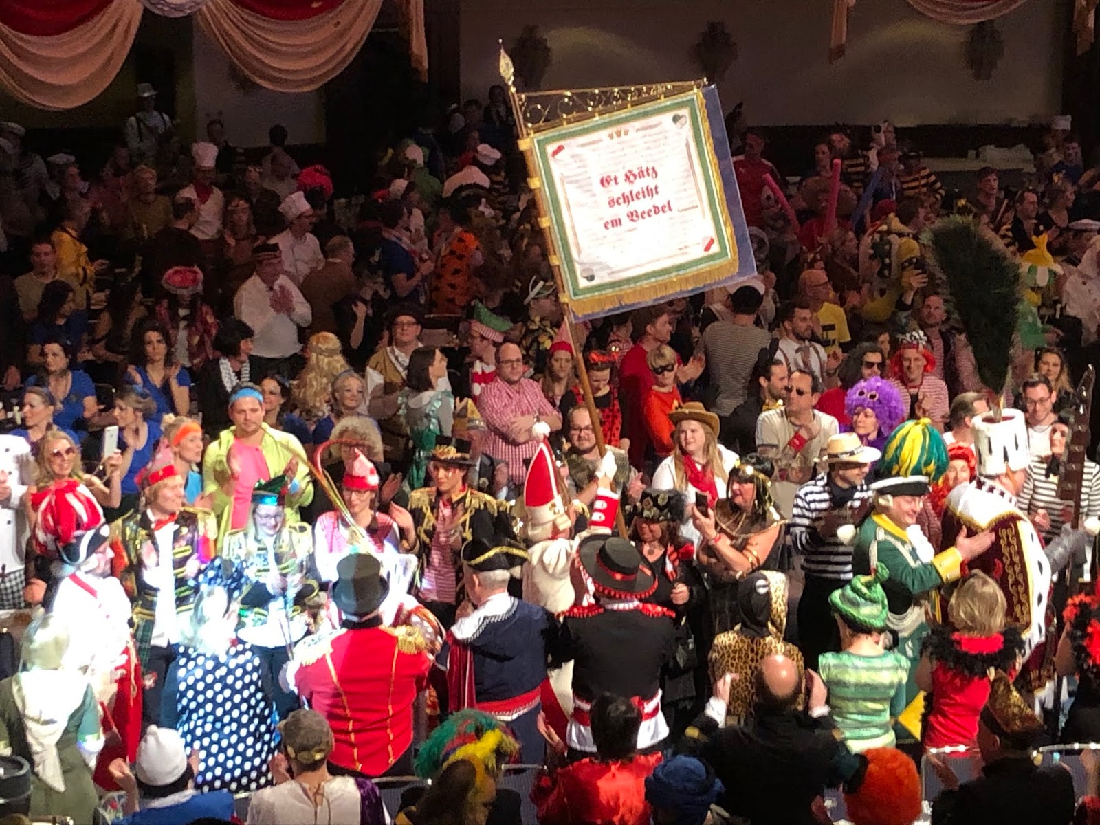 Wo ich nun also mehrere Jahre Zeit hatte mich anzupassen, lag es nahe, doch auch einmal das Unvorstellbare zu wagen und eine Kölner Karnevalssitzung zu besuchen. So richtig. Mit Brings, Dreigestirn, Bernd Stelter, inmitten Unmengen von Kölschfässchen leersaufenden Bienen, Ärzten, Einhörnern, Planeten und vereinzelt, allen Blackfacing-Skandalen zum Trotz, tatsächlich Indianern. Mit zwei auf dem karnevalistischen Parkett ebenfalls nicht trittsicheren Kollegen und einer Kollegin, die einige Jahre pausiert, aber immerhin noch Kostümbestandteile und Karnevalsliederkenntnisse von früher hatte, schritt ich als Teil eines bunt kostümierten Quartetts mutig ins Maritim Hotel. Sagen wir so: Ich bin jetzt um diese Erfahrung reicher. Ich habe sogar einen Orden bekommen, mit dem diesjährigen Karnevalsmotto „Et Hätz schleiht em Veedel!“ drauf. Meine Kollegin und ich haben sehr viel Geld für eine Flasche Metternich-Sekt bezahlt und diese behutsam leergetrunken, während an den umliegenden Tischen Fässchentauschszenen in einer Umschlaghäufigkeit stattfanden, die mich sehr an Wildschweingelage in Asterix-Comics denken ließen. (Einen Asterix allerdings habe ich nicht gesehen.) Vom Grölpegel her sicher vergleichbar, wobei ich glaube, dass die ganze Veranstaltung, da doch eher teuer, noch gemäßigt, womöglich geradezu spießig ablief im Vergleich zu dem, was man sonst erleben könnte im Karneval. Von der Belastungsstärke für mich aber allemal ausreichend.