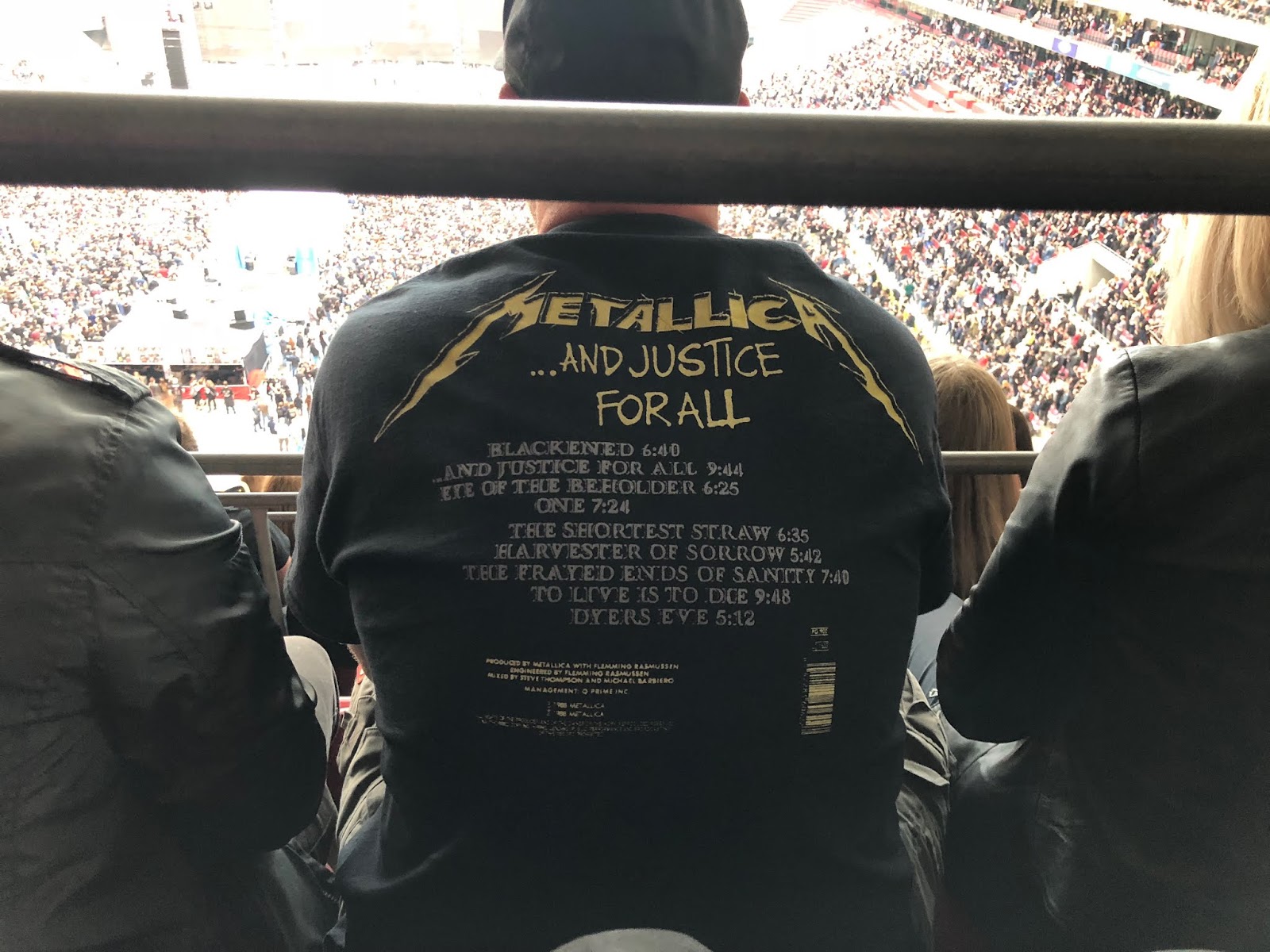 Zwischendurch würde ich am liebsten die Augen geschlossen halten, mich in den Gitarren- und Basswellen verlieren und weit, weit raus treiben lassen – aber das geht schließlich immer, ohne dass die Band direkt gegenüber auf der Bühne performt, wofür man viel Geld bezahlt hat. Also: Augen auf, Harmuth. Es lohnt sich. Ich wünsche mir, dass dieses Konzert nie zu Ende geht. Musik hat so viele Kräfte, öffnet Schleusen, rührt, berührt, trägt durch Jahrzehnte, Raum und Zeit – vorausgesetzt es gibt die Band lange genug. Bei Metallica ist das glücklicherweise so. Zwischendurch bin ich 16, stecke im Oberstufenstress, finde Metal gut, werde von den harten Jahrgangsjungs, die mit „Sepultura“- und „Slayer“-Shirts hinten in Klasse und Bus rumhängen und in der Pausenhofecke rauchen, aber natürlich überhaupt nicht ernst genommen. Von diesen Shirts sehe ich viele im Publikum, zum Teil auch als zeithistorisch überdauernde Textiloriginale aus den 1980ern und 90ern, wie im einen oder anderen Fall tatsächlich auch der jeweilige Träger des T-Shirts. Männer, die seit Jahrzehnten so aussehen, wie sie aussehen. Mit ausgerissener Jeansweste, Aufnähern und Stickern, blond gesträhntem Mähnen-Vokuhila und Schnäuzer, mit dünnen, in Stretchhosen gesteckten Mikado-Beinchen. Ich überlege, ob es besser gewesen wäre, wie diese Metaljünger nicht nur gelegentlich wie bei einem solchen Mega-Konzert eine Zeitreise zu unternehmen, sondern das komplette Leben als Zeitreise zu gestalten. Offenbar hätte man auch mit dem Style und Setting der frühen Neunziger erfolgreich bis heute überdauern können.