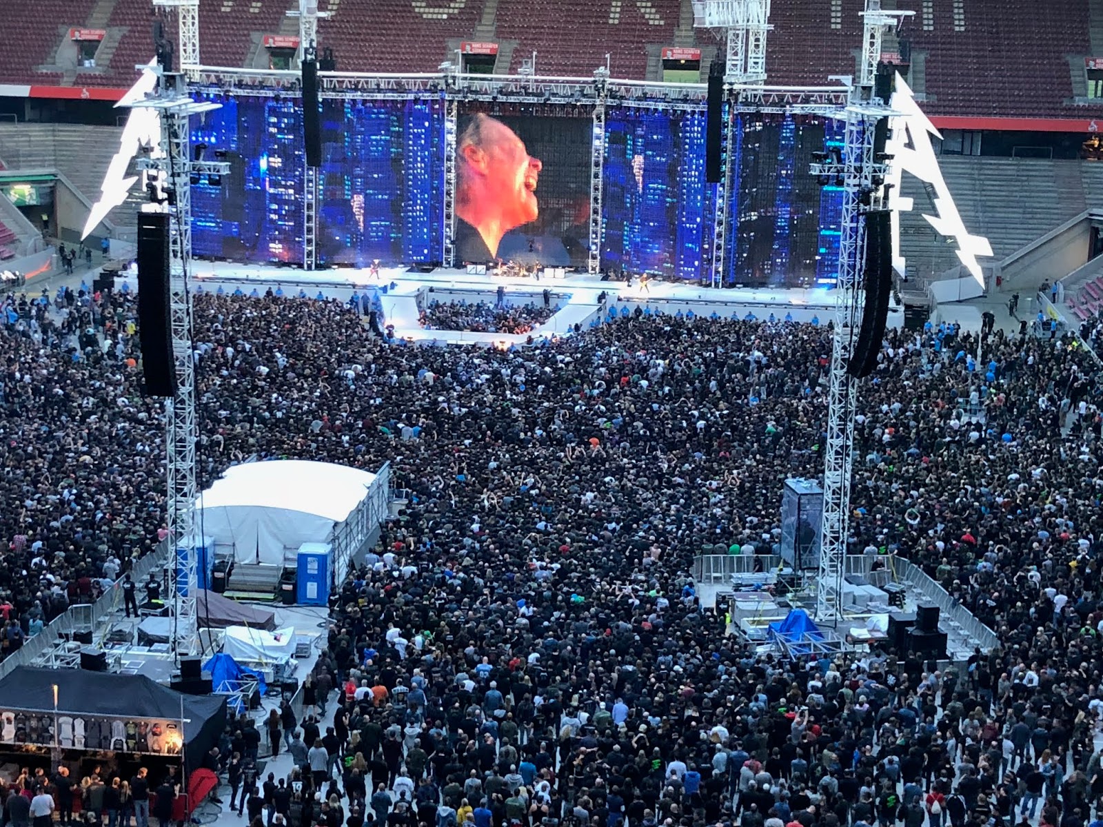 Als Metallica auf die Bühne kommen, gibt es kein Warm-up oder sanftes Reinkommen. Vielmehr brettern die Jungs los, es bleibt keine Zeit, auch nur Luft zu holen. Der Eröffnungssong ist schnell, getrieben und hart, und sofort sind die Fans bei der Sache. Im zweiten Song wird in den Reihen vor mir schon aufgestanden. Und ich sitze weit oben und weit hinten. Die Musik peitscht und treibt, Stillsitzen unmöglich. Metallica feiern ihr Publikum, das Publikum feiert Metallica. So wird es über Stunden bleiben. Feuerwerk und Pyrotechnik inklusive. Ich lerne: Metallica-Fans sind treu und textsicher (bis auf mich, die Einzige unter 45.000) – es gibt Songs, die das Stadion komplett mitsingt. Echte Gänsehaut-Momente, auch für die Künstler. Die sind sichtlich angetan von ihrem Kölner Publikum, bringen zwischendurch eine Metallica-Version von „Viva Colonia“ – die Stimmung kocht.
