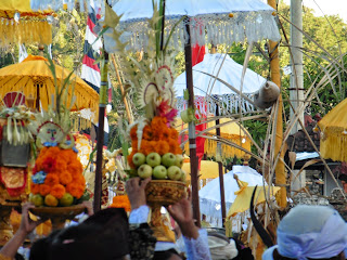 | Prozessionen mit entsprechenden Opfergaben, dann kunstvoll aufgetürmten Obst- und Blütenarrangements, sind auch häufig anzutreffen. Sie ziehen sich oft über mehrere Tage hin. |