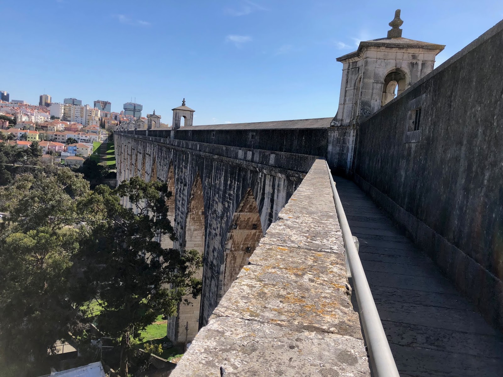 | Auf dem Aqueduto das Águas Livres. Hier ist man allein. Wir trafen auf ein verstörtes osteuropäisches Paar, das uns entgeistert fragte, ob das denn nun alles sei, einfach auf der Mauer hin- und herlaufen? |