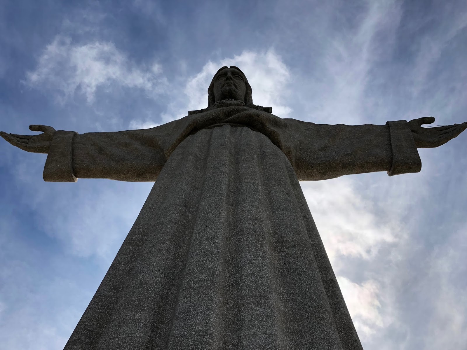 | Man pirscht sich von hinten über einen großen Platz an die Statue heran. Deren Blick und die offenen Arme sind auf das andere Ufer, die Stadt Lissabon, gerichtet. |